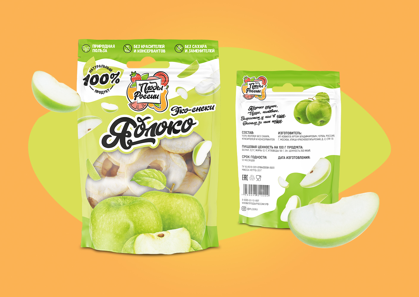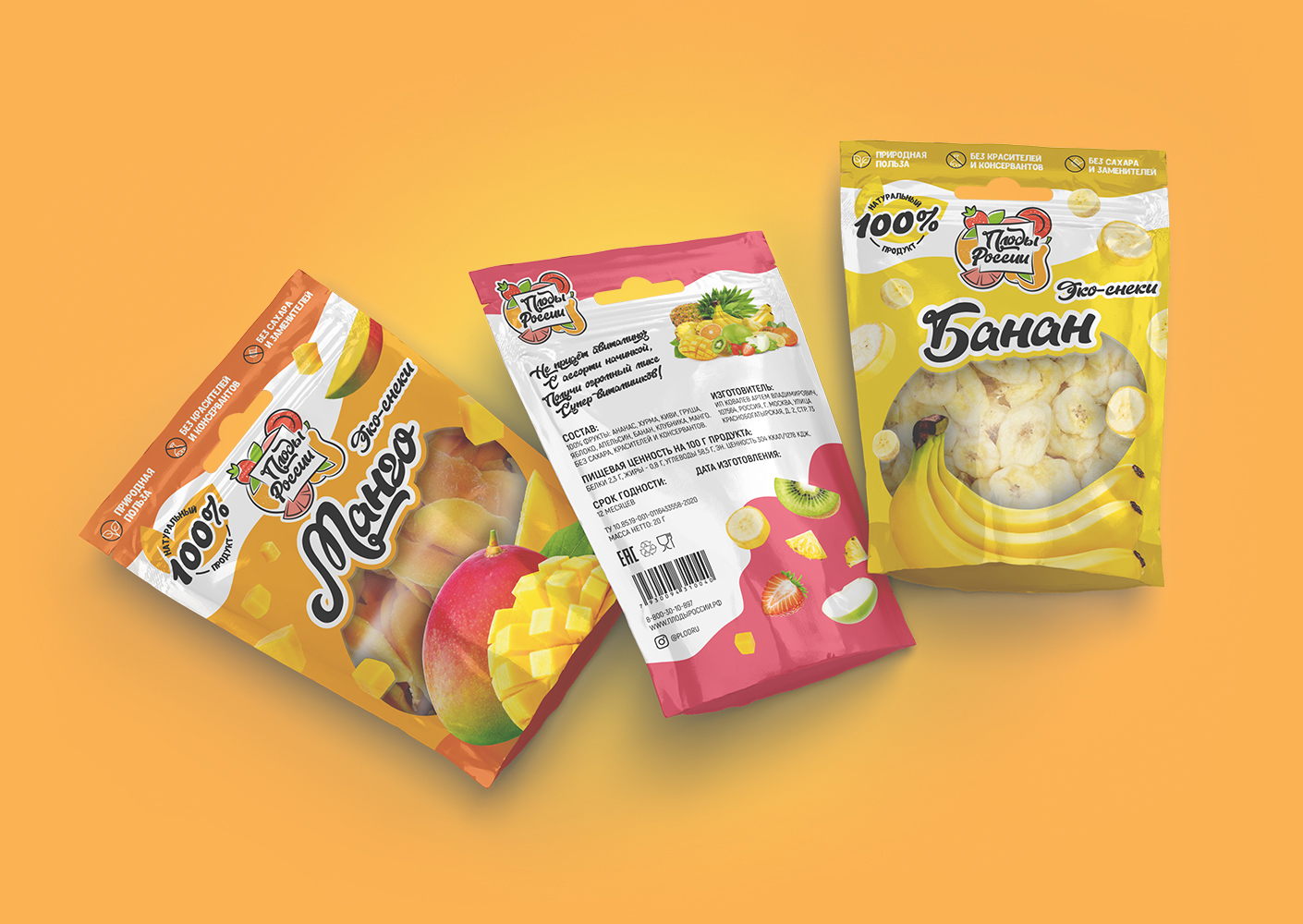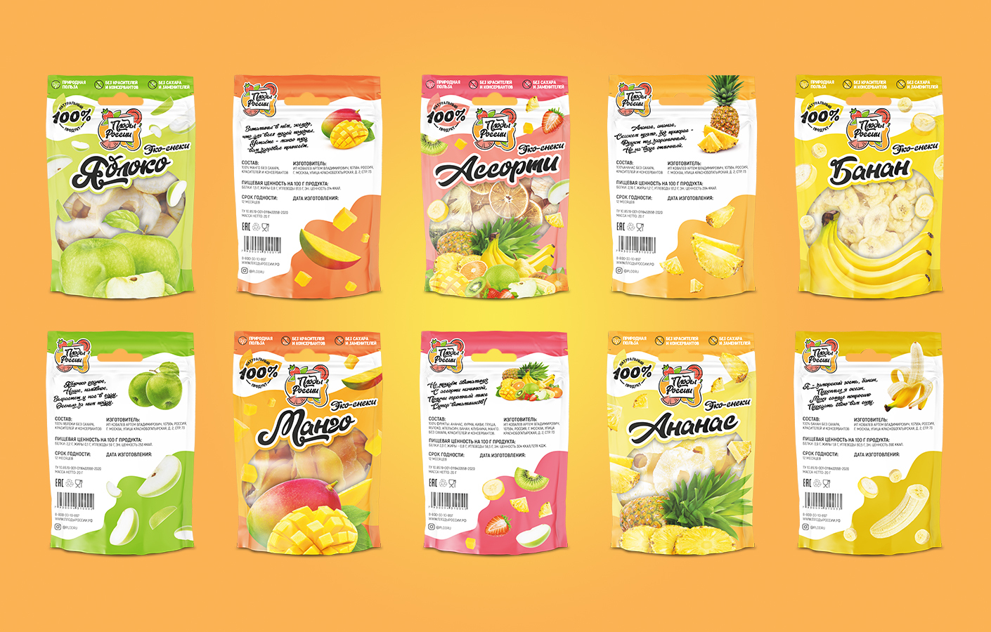 Серия продукции включает в себя 5 вкусов: ананас, банан, яблоко, манго и ассорти из фруктов и ягод. На каждом пакете предусмотрено прозрачное окошко, через которое виден сам продукт. Яркий дизайн с крупными аппетитными фруктами будет выделяться среди конкурентов, поскольку нишевые продукты зачастую производятся в крафтовых пакетах, не позволяющих напечатать яркие сочные цвета.